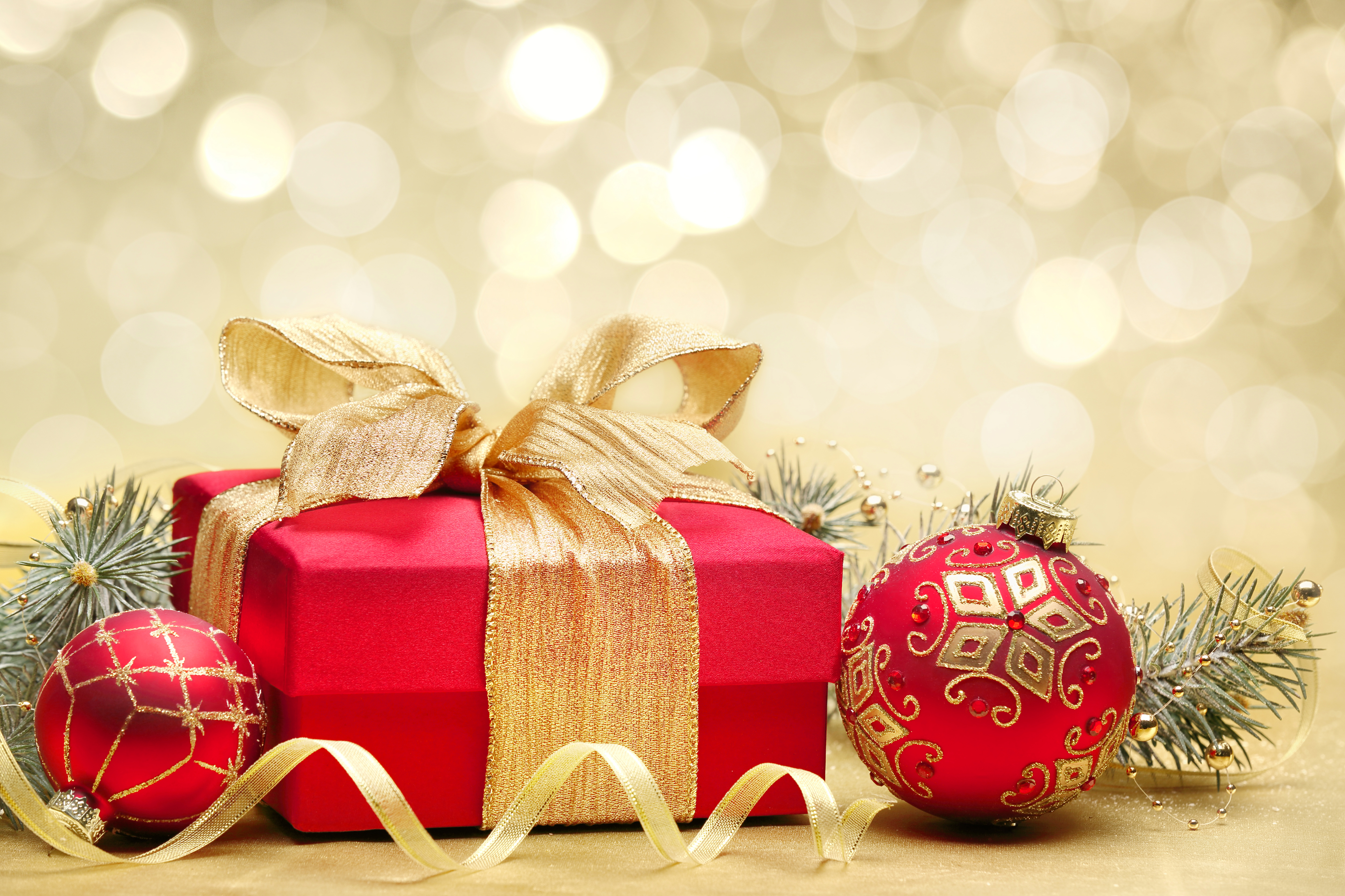This Background: "Christmas Background with Red Gift and Ornaments" is part of