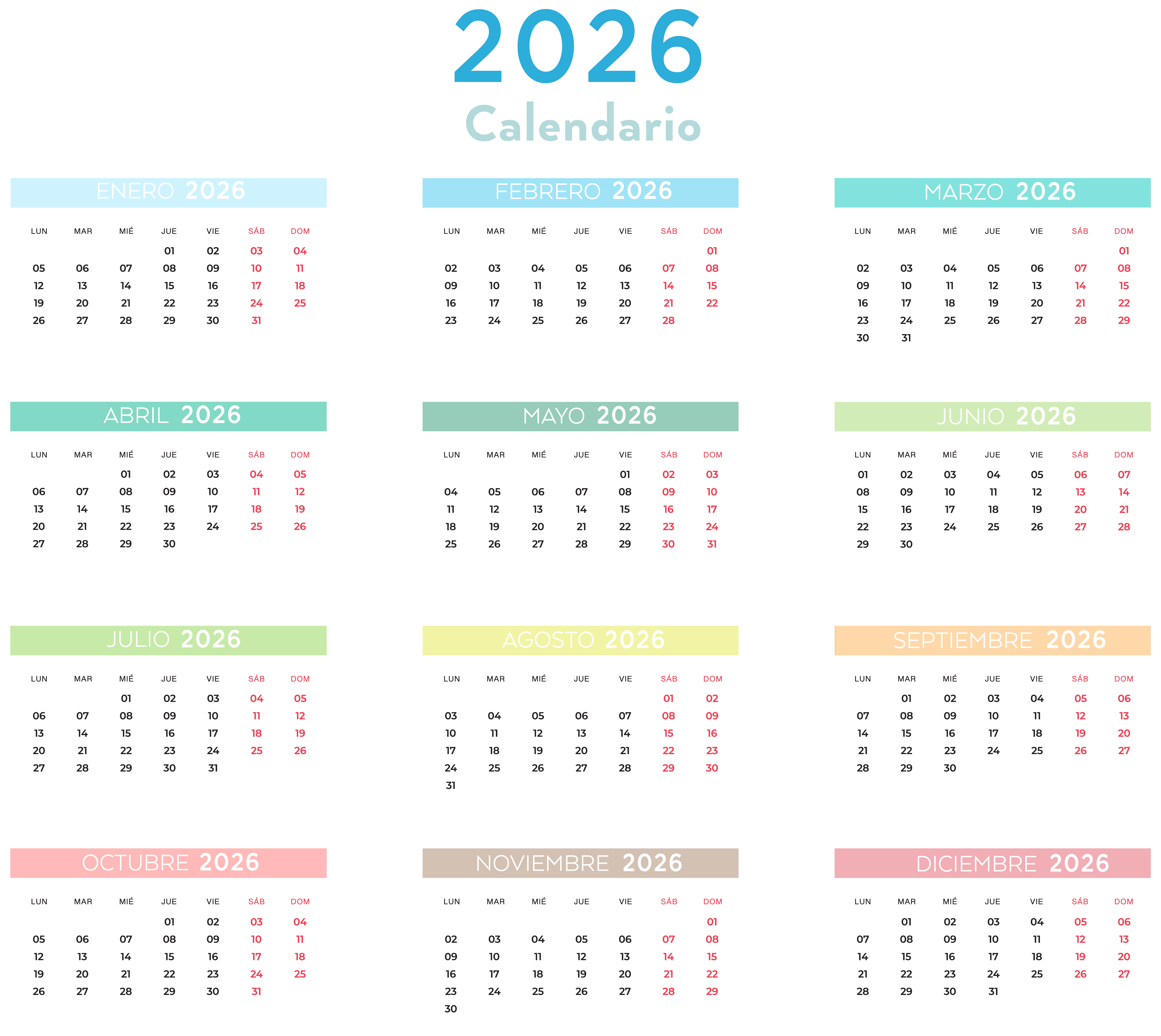 This Clipart Image: "2026 Spanish Colors Calendar Transparent Clipart" is part of
