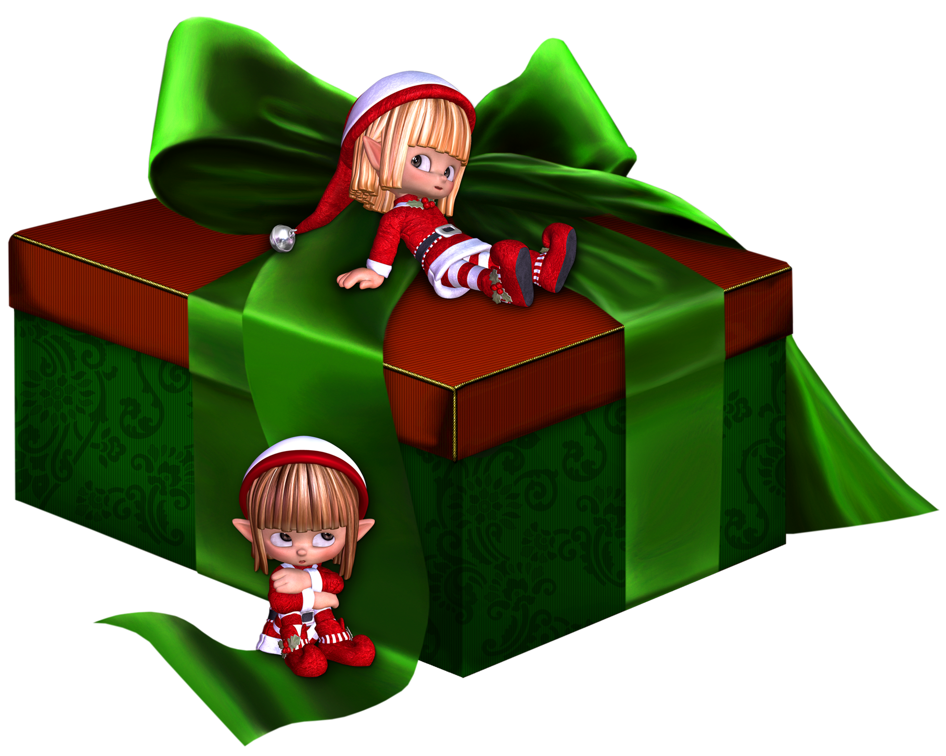 This Clipart Image: "Green and Red 3D Present with Elfs Clipart" is part of