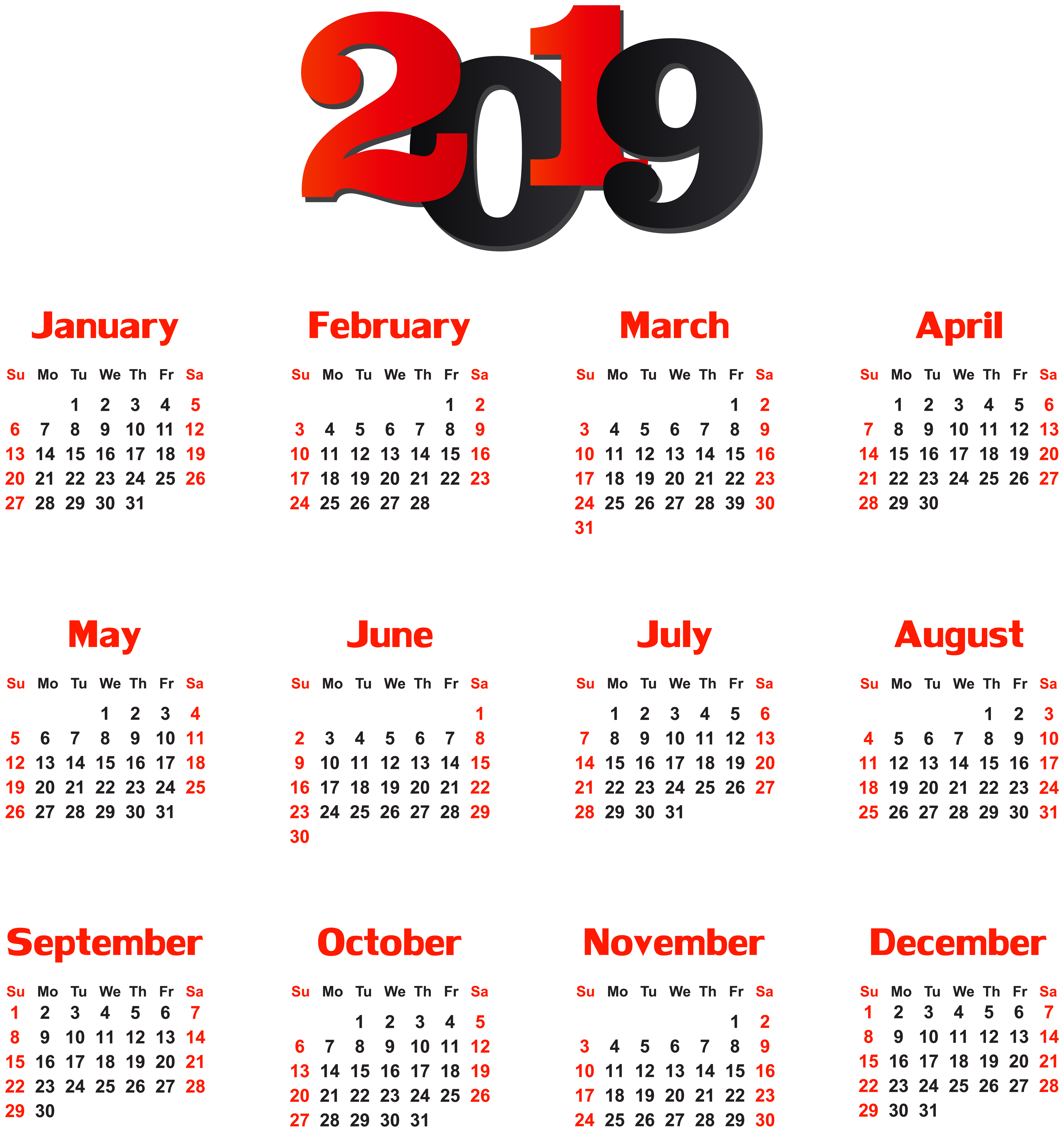 This Clipart Image: "2019 Calendar Transparent PNG Clip Art" is part of