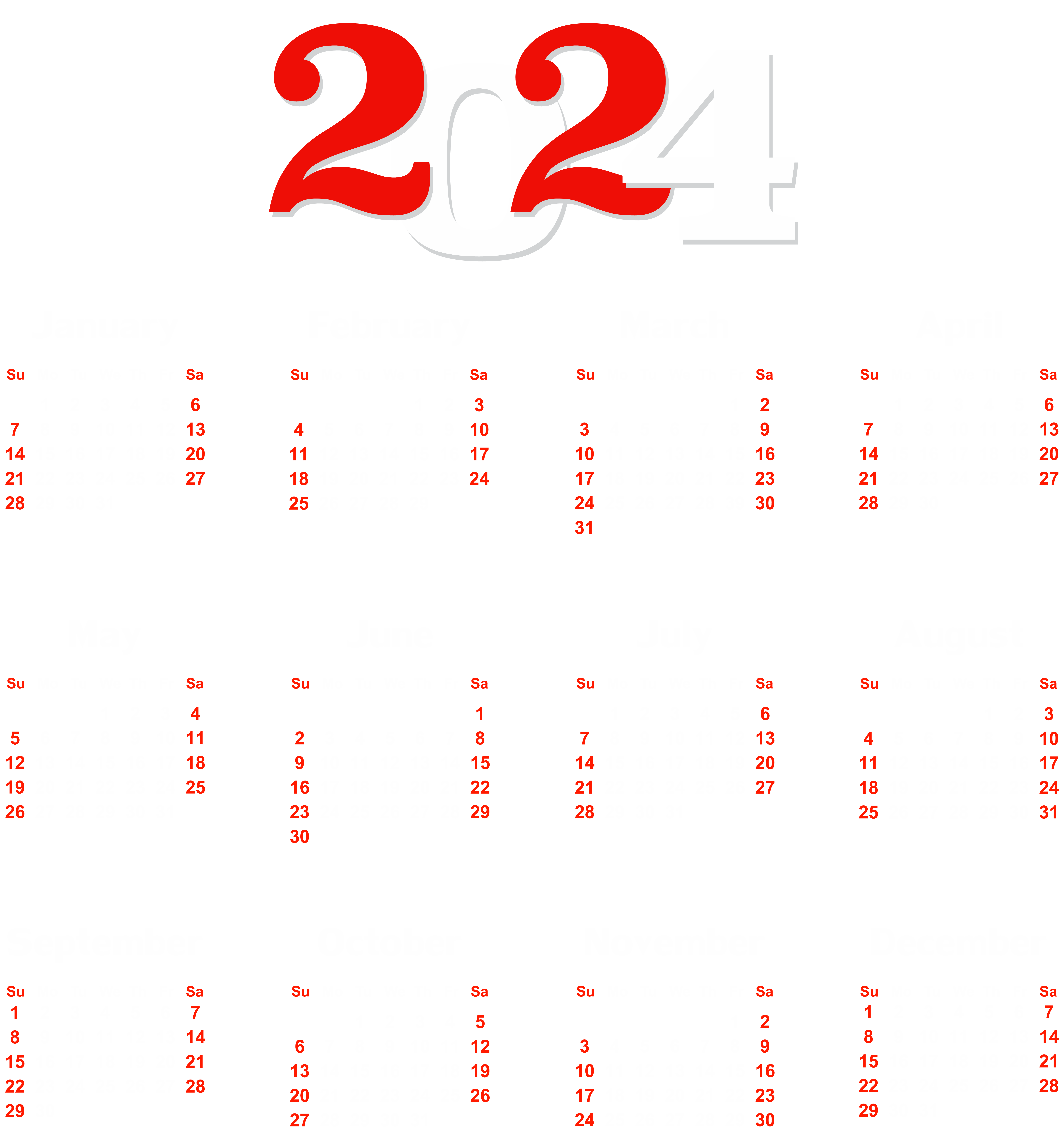 This Clipart Image: "2024 Calendar White Transparent PNG Clip Art" is part of