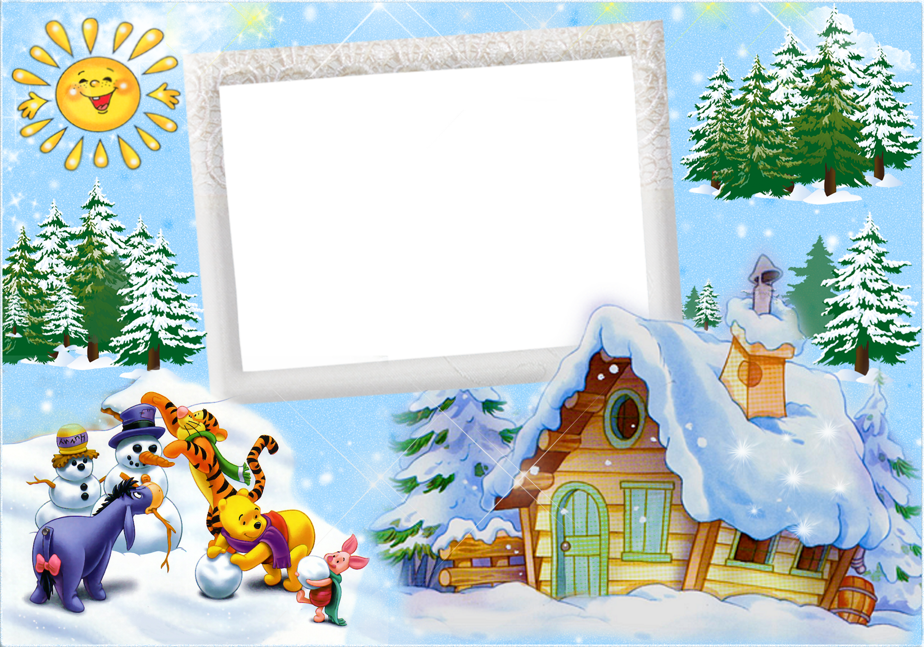 This Holiday Frame: "Christmas Kids Winter Frame with Winnie the Pooh and Friends and Snowman" is part of