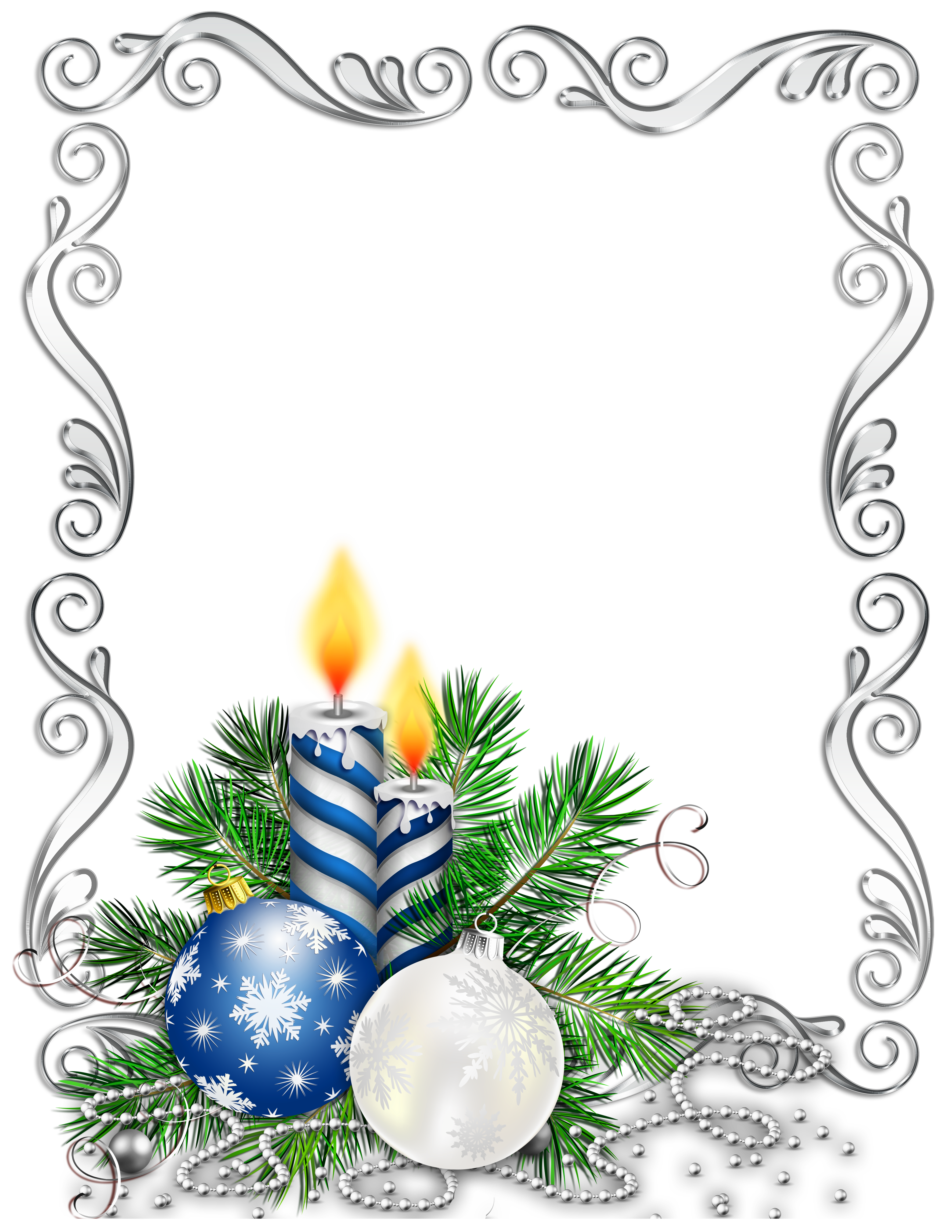 This Holiday Frame: "Large Transparent Silver Christmas Photo Frame with Blue Candles and Christmas Balls" is part of